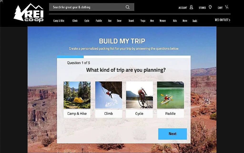 Following user research, we decided on a feature called "Build My Trip", an interactive feature that offers the same level of in-store expertise to online customers. Many users shared with us that they value the knowledge that REI employees share with customers in store. However, the online shopping experience can feel challenging because shoppers are unable to leverage this unique customer service. The "Build My Trip" feature provides a suggested checklist for shoppers that is developed from their answers to a short questionnaire about their trip. This checklist also suggests preferred products to the customer based on the nature of their trip, providing a personalized online shopping experience.